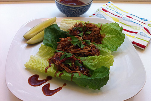 5. Shred cooked pork into thick pieces with a fork and separate into six servings. Mix each serving with 2 tbsp cooked blackberry sauce. Serve over hearts of romaine, and garnish with parsley.