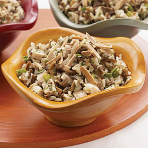 - Cook wild rice and brown rice according to package directions, omitting salt and fat. Combine wild rice and brown rice, and spread rice mixture in a thin layer in a baking pan. Refrigerate 30 minutes or until cool, stirring occasionally. Combine chilled rice mixture, chicken, and Orange-Mango Vinaigrette in a large bowl; toss well. Spoon rice mixture evenly onto each of 4 serving plates; sprinkle evenly with almonds.