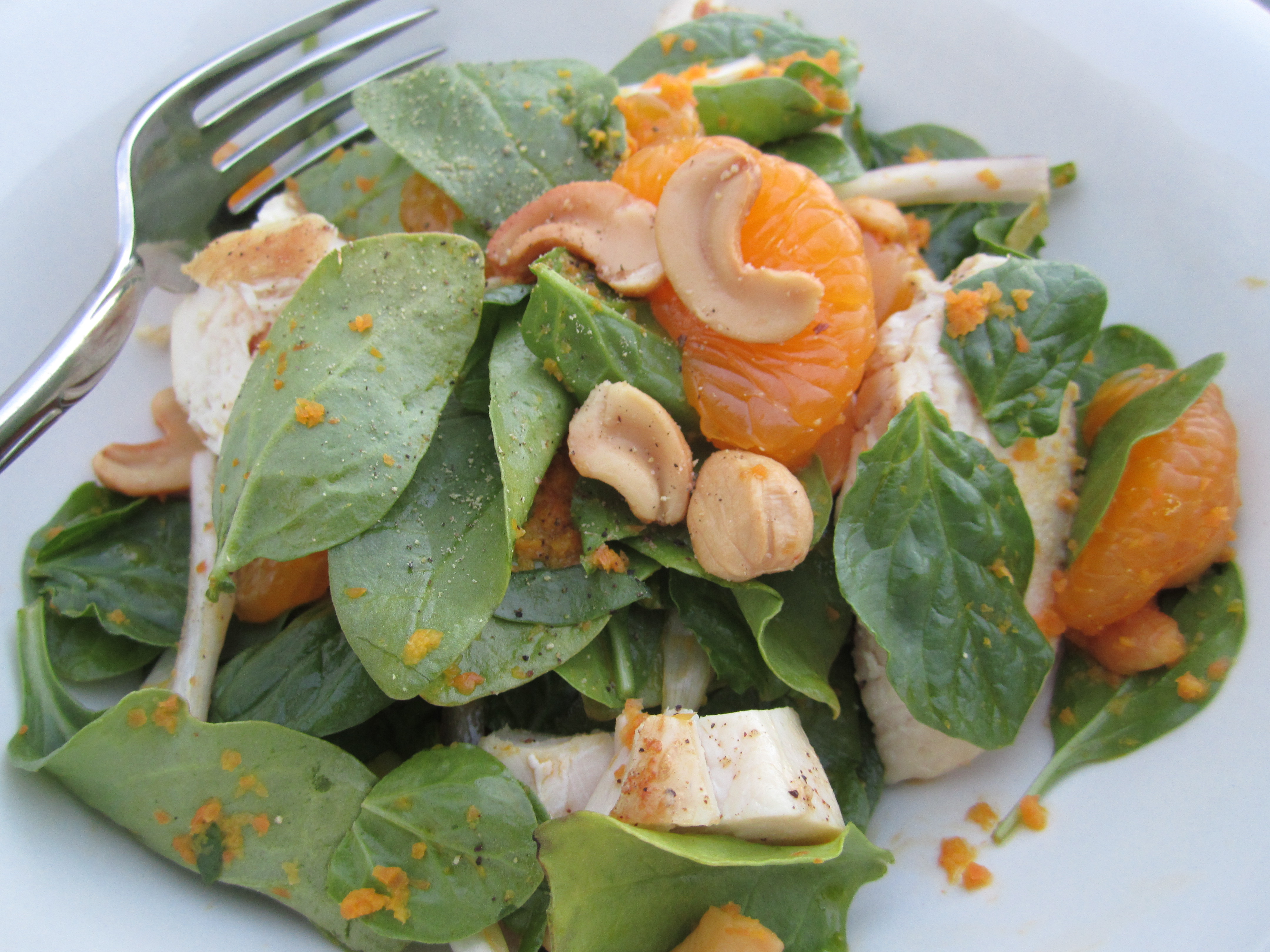 - Place spinach in a large bowl and add reserved shallot and oranges. Add cashews and reserved dressing and toss to combine. Divide salad among serving bowls.